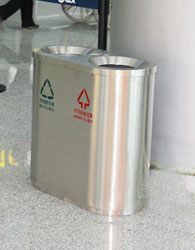 此款C130A萬達專用桶,是專門為佛山萬達廣場打造滴。恰巧被國美電器商行負責人看中,非他不可。此款不銹鋼垃圾桶的規格為:582*272*650mm。商場不銹鋼垃圾桶表面砂鋼色澤,頂部投遞口有一塊橢圓形狀蓋著,不銹鋼垃圾桶圓形投遞口扔垃圾處有斜邊,直接方便投放垃圾物品。上蓋及桶身都有絲印標志,方便分類垃圾。配置鍍鋅板內桶,便于垃圾清倒;不銹鋼垃圾桶采用優質的304#優質不銹鋼材料模壓成型,經過工廠專業的技術員制作,數控折彎,滾圓,激光,焊機等多種工序加工而成。金屬亮澤 ,高雅美觀。