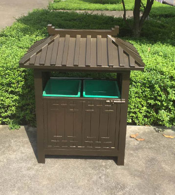 欣方圳景區(qū)古典鋼制分類垃圾桶戶外擺放圖