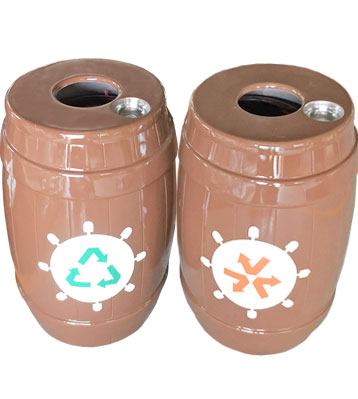 玻璃鋼仿木分類垃圾桶采用高品質玻璃鋼,打造仿木塊圍圓周鑲嵌成圓形木桶造型設計效果,桶頭開孔做垃圾投口內嵌煙灰缸,顏色可定制。