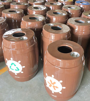 經打磨、除塵、噴漆等一系列后期工藝然后出成品,表面光滑平整,仿木效果逼真,內桶也采用玻璃鋼材質制作,長期擺放于景區戶外抗老化更耐用,可單獨使用,也可多個組合擺放做分類垃圾桶!