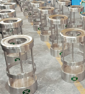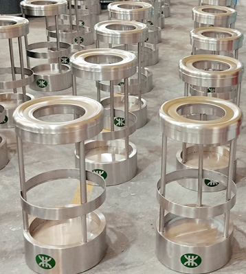 地鐵站簡易套袋透明防爆果皮箱外觀圓形設計,3根實心不銹鋼立柱等分與桶頭底座焊接成型,中間圓形包邊加固,可視設計垃圾存放情況一目了然。