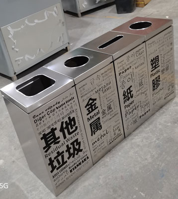 • 產品材質:多國文字組合式垃圾桶可選擇201或304不銹鋼材質制作,單個組合成金屬、塑料、紙類、其他垃圾室內4分類垃圾收集容器,足厚用料產品做工扎實,表面絲印多國垃圾分類文字版本。優質不銹鋼材料激光切割成型,桶身顏色為不銹鋼本色。加厚防銹,不易破損;金屬亮澤,高雅美觀,投放便利,廣泛適用于各種室內場所;內外表面光潔,減少垃圾殘留,易于清潔;配置鍍鋅板內桶,便于垃圾清倒;