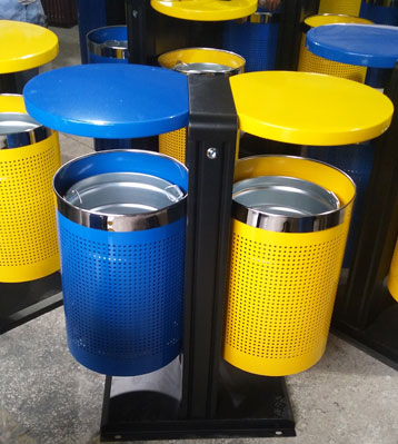• 產品材質:戶外鋼板烤漆分類垃圾桶采用優質冷軋鋼材料經剪鈑下料、折彎、沖壓、焊接、打磨、等工藝:表面經過除油、噴砂防銹處理后,再進行酸洗磷化處理;表面清理干燥后整體進行靜電噴涂或烤漆處理,靜電噴涂是經過流水線高溫固化爐固化后再出爐冷卻,加工后的塑粉附著力強,不易剝落;